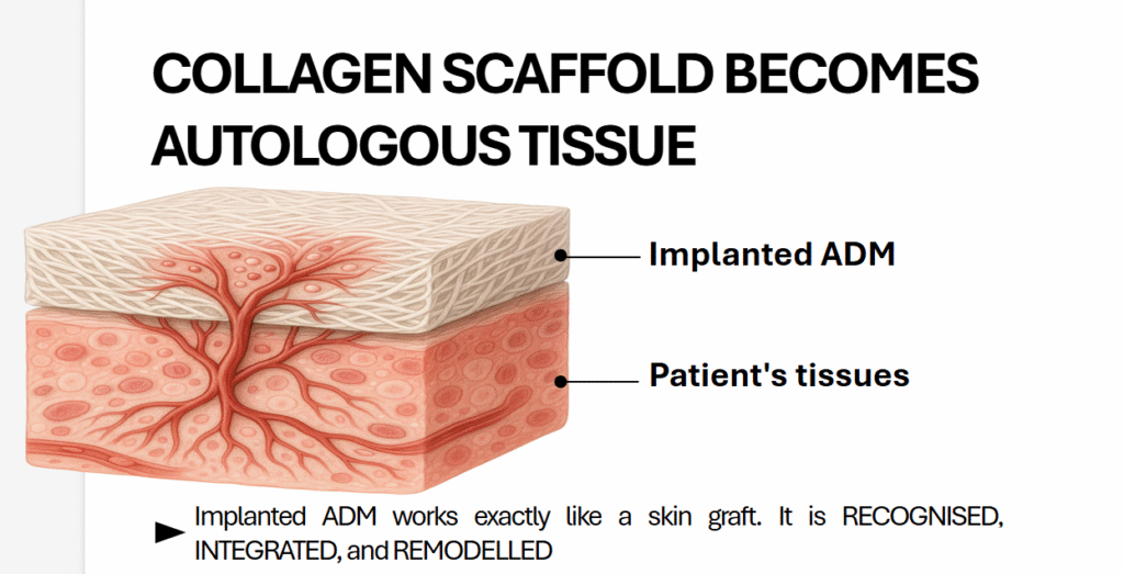 Имплантираният BRAXON ADM работи точно като кожна присадка. Той се разпознава, интегрира и ремоделира.